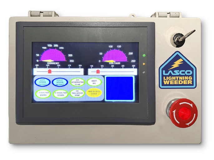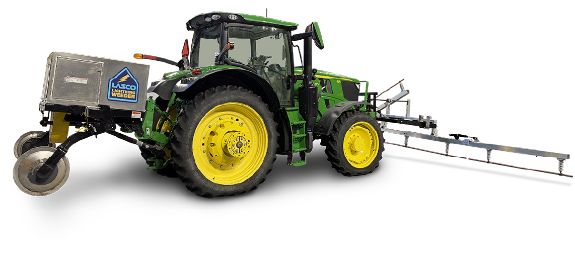 Lightning Weeder is a commercial tractor-mounted electric weed control unit that is currently being used in the U.S. to target tall weeds without the use of herbicides. The power source is a power take-off (PTO) driven, brushless alternator that is connected to the applicator bar through high voltage cables. The power unit hooks to a 3-point attachment and the applicator bar can be mounted in front or used as a pull-behind. Lightning Weeder requires a tractor that has at least 120 PTO horsepower.