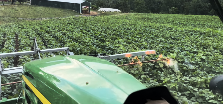 The hydraulically controlled copper applicator bar is up to 40 feet wide. It adjusts to variable heights to cope with any crop that has weeds above the crop canopy: tomatoes, broccoli, cauliflower, lettuce, spinach, soy, edible beans, peanuts, sugar beets, wheat, barley, to name a few.